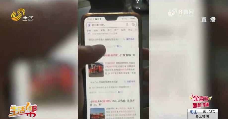 潍坊市民李先生说:“承诺我们,在百度上手机端和电脑端,只要搜树枝粉碎机这个词汇,我们的产品还有公司名称,会在(百度上排)前三名,2月24号上线以后,搜索树枝粉碎机这个词汇,没有出现我们公司的名字,必须要刷新三四次才能出现。”